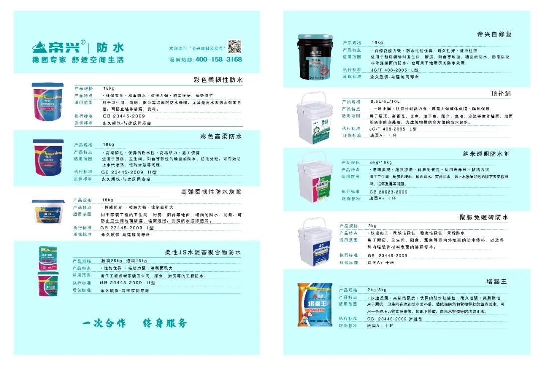 该产品是一款彩色水泥基防水产品。有一定柔韧性,可以抵御基层轻微的震荡和微小位移;也可用于厨卫、地下室、水池、地下隧道等工程……