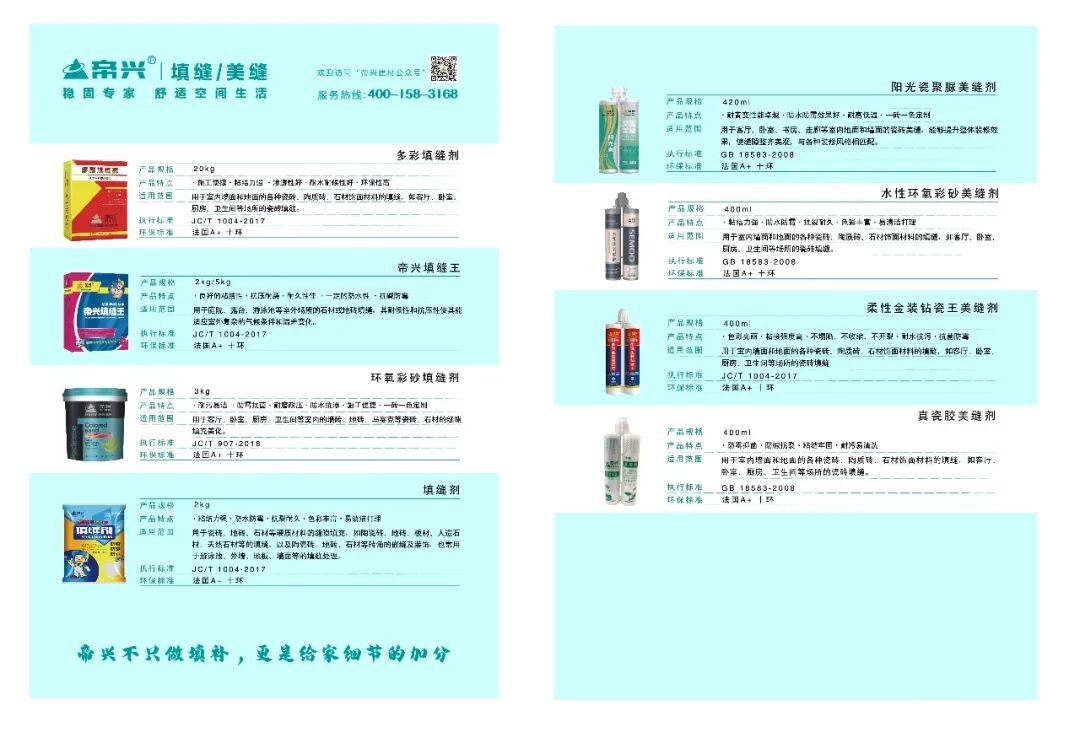 产品描述帝兴净味钻瓷王是高品质的双组份环保美缝产品,利用先进设备和精良的工艺制成。产品特点:色彩丰富,光亮如瓷;具有防霉抑菌……