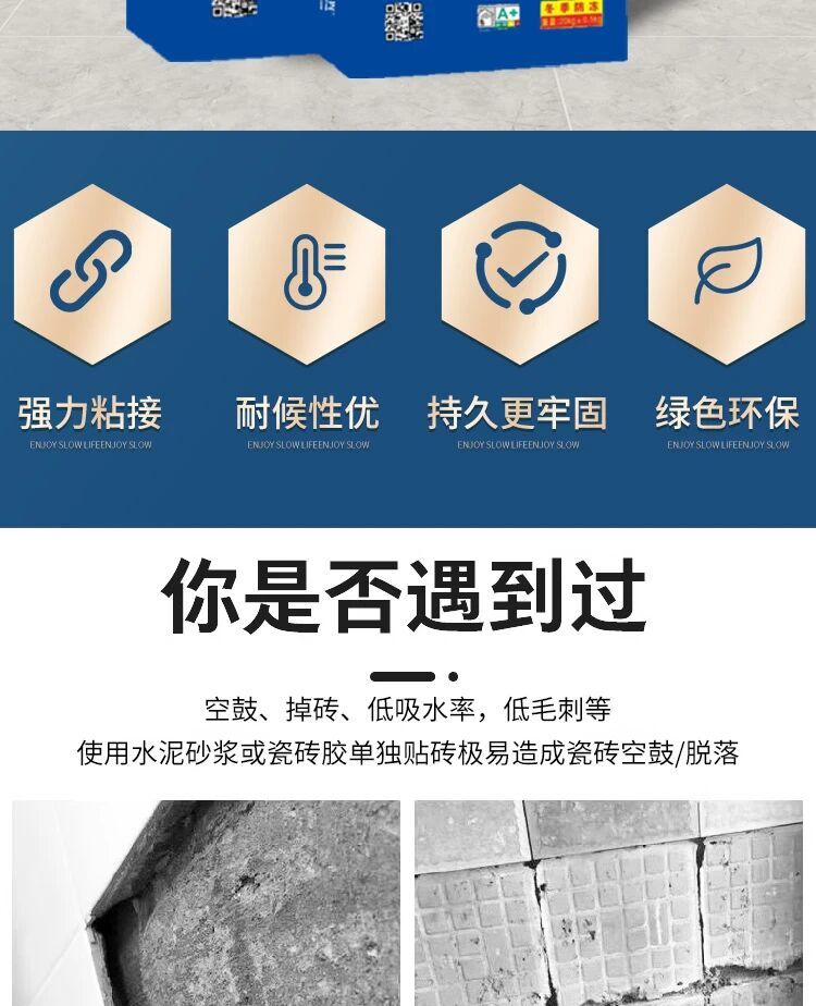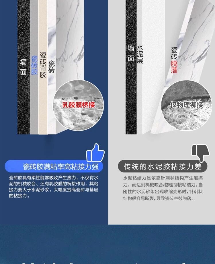 产品描述:本品能够吸收基层与瓷砖微小形变产生的应力,并且能够保证瓷砖粘结材料固化后与胶膜形成化学交联与物理的卯样协同粘结作……
